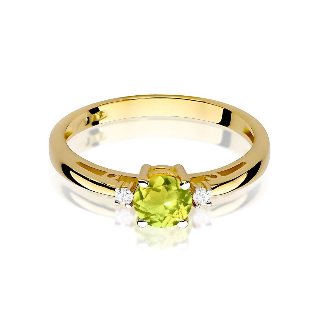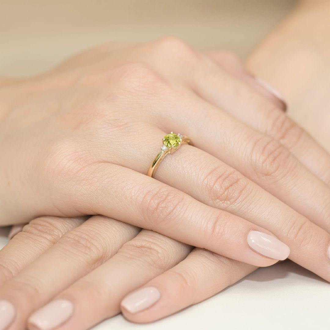 Descubre el brillo natural del peridoto, una gema luminosa que aporta color y elegancia a este anillo de oro amarillo 14K con diamantes, una joya delicada y sofisticada para cualquier ocasión.
