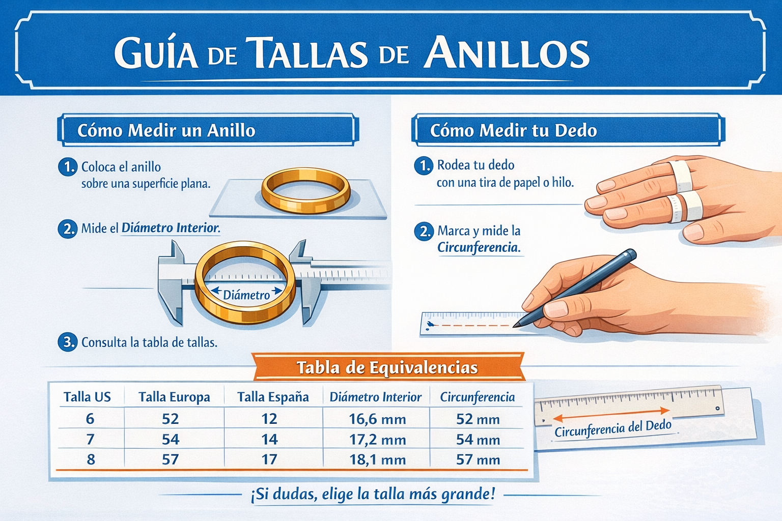 ✔ Los anillos anchos suelen necesitar media talla más.