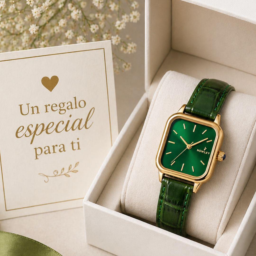 El reloj Nowley para mujer en tono verde destaca por su diseño elegante y lleno de personalidad. Su esfera verde con acabado satinado ligeramente claro aporta luz y sofisticación, creando un efecto visual moderno y muy favorecedor.