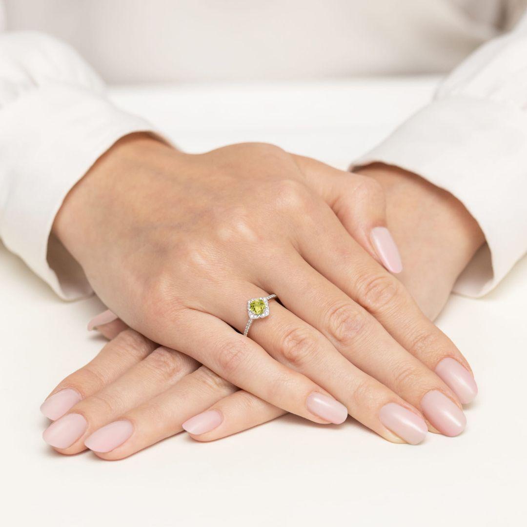Anillo fino pero elegante de oro blanco 14K con peridoto natural y diamantes, una joya luminosa que destaca por su intenso color verde rodeado de brillantes diamantes. Su diseño delicado y sofisticado lo convierte en una pieza perfecta para el día a día o para ocasiones especiales, además de ser un regalo hermoso y lleno de significado.
