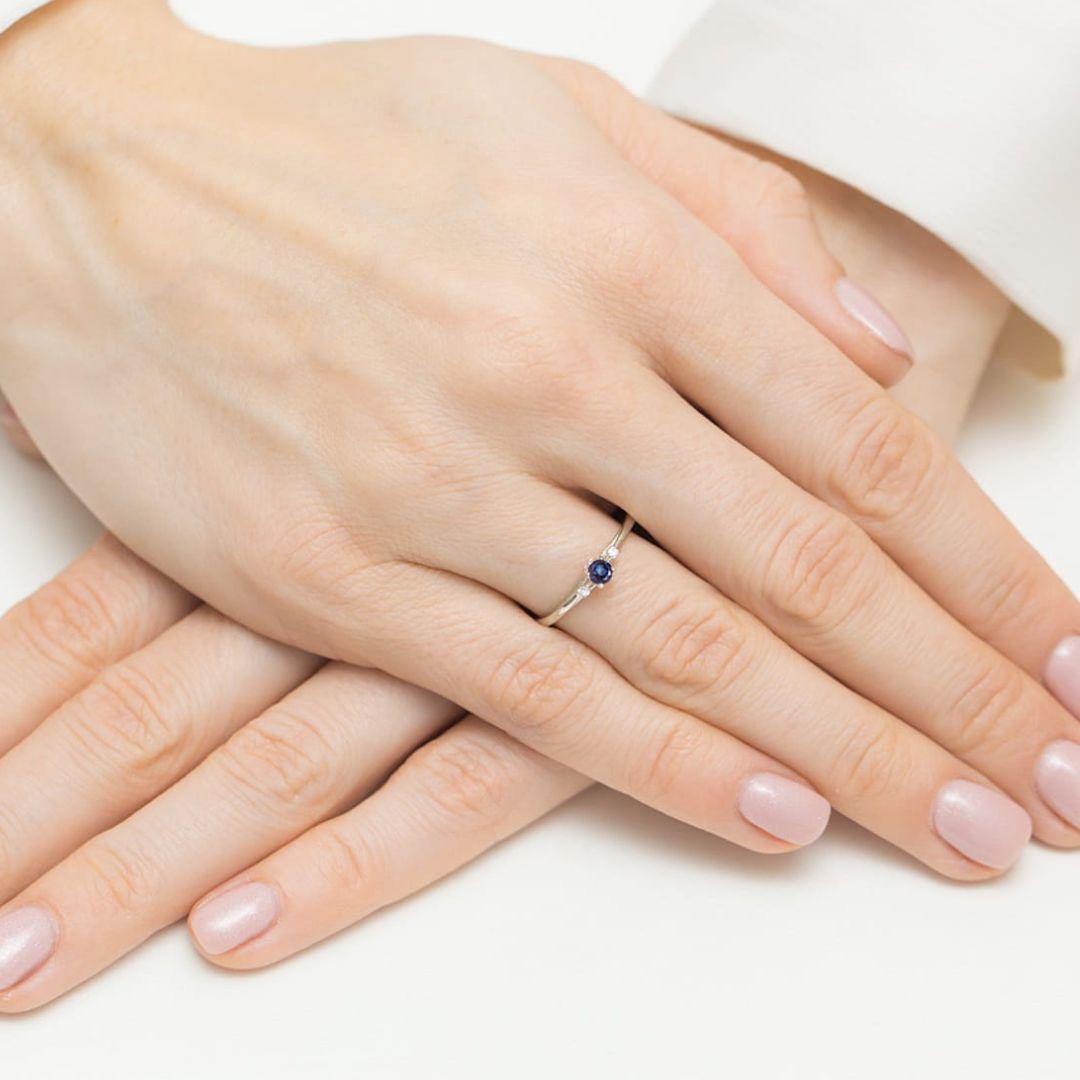 Anillo fino y elegante de oro blanco 14K con zafiro natural y diamantes, una joya delicada que destaca por el intenso azul de su piedra central. Su diseño refinado aporta brillo y sofisticación, perfecto para llevar a diario o en ocasiones especiales, además de ser un regalo hermoso y lleno de significado.