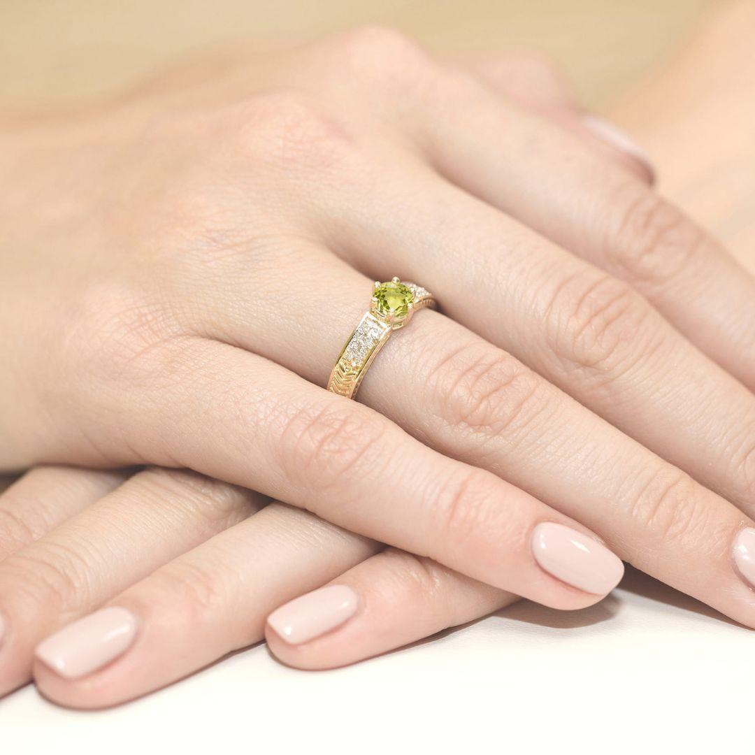 Anillo elegante de oro amarillo 9K con peridoto natural, una joya luminosa que destaca por su intenso color verde y su diseño sofisticado. El peridoto central se realza con diamantes laterales, creando un equilibrio perfecto entre brillo, elegancia y carácter.