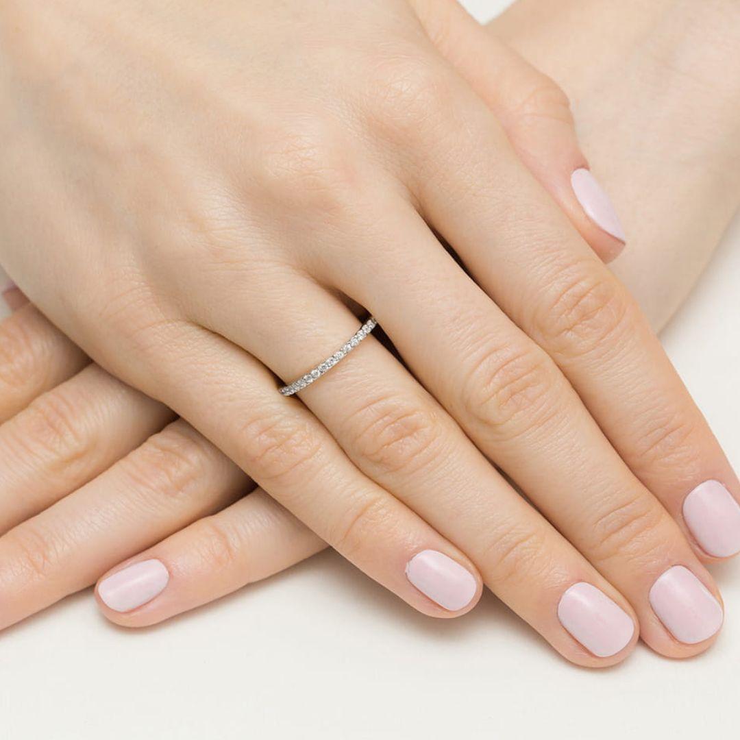 Los anillos tipo media alianza eternidad simbolizan el amor continuo y el compromiso duradero, por lo que son muy elegidos para aniversarios o para acompañar anillos de compromiso.
