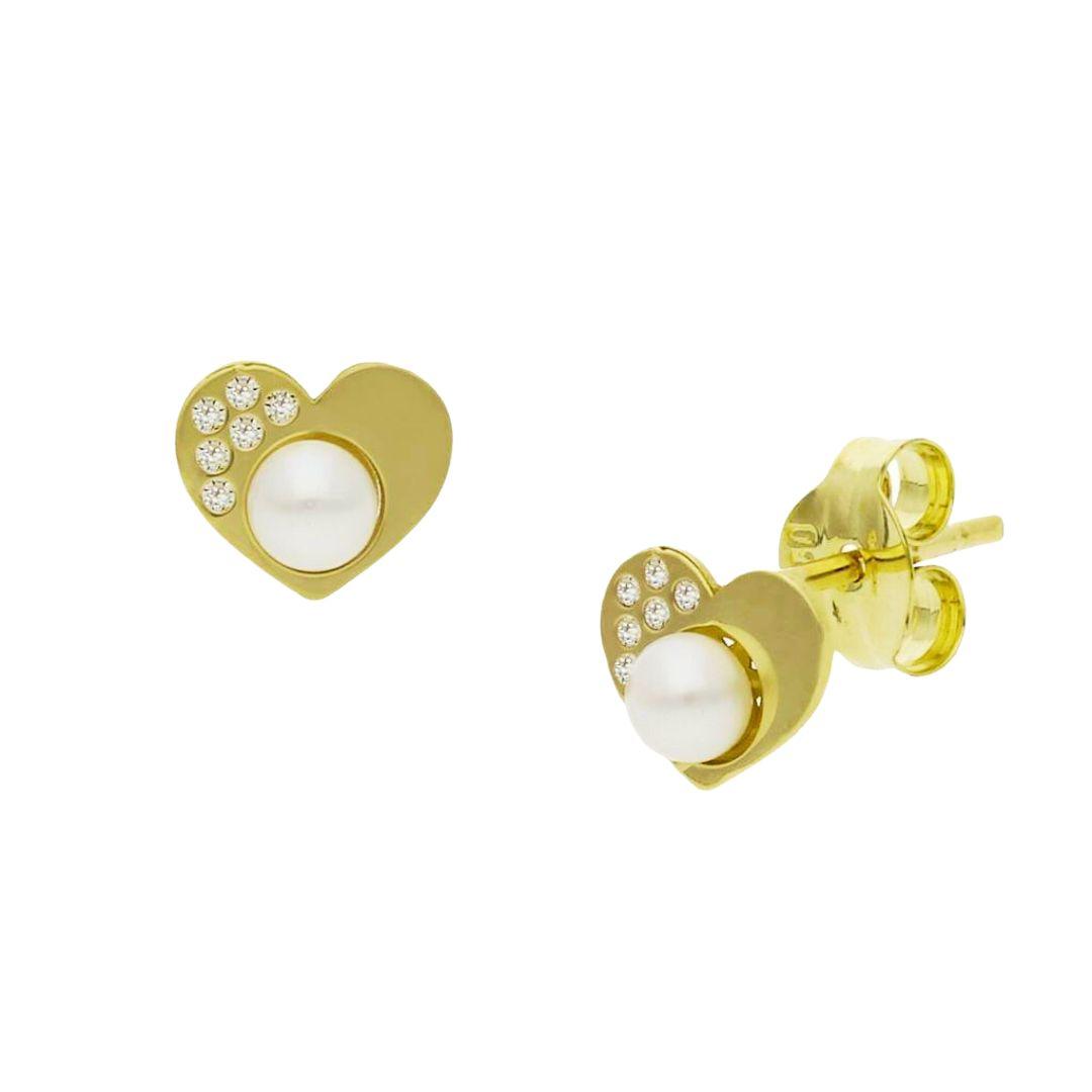 Delicados pendientes de corazón en oro 18K con perla y circonitas, un diseño elegante y femenino con cierre de presión ideal para el día a día.