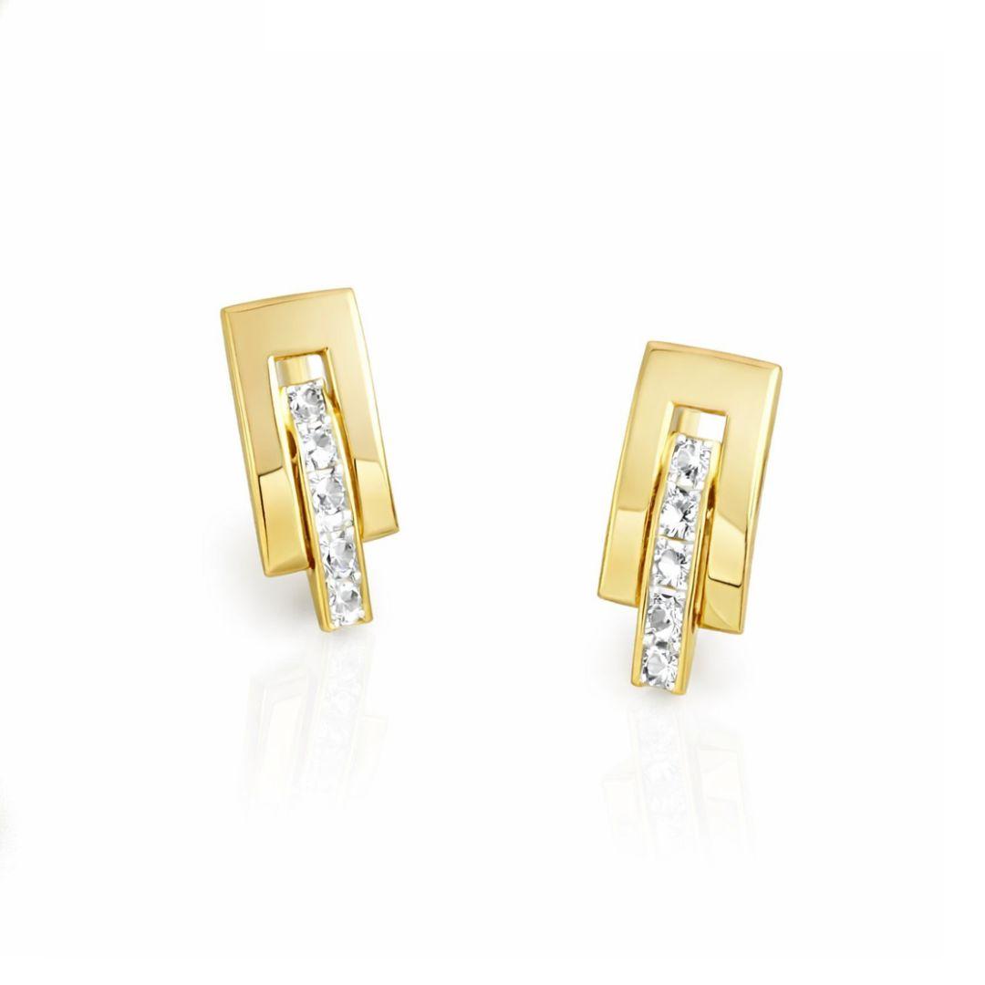 Sofisticados pendientes de oro 18K con circonitas blancas, diseño geométrico moderno con brillo delicado.