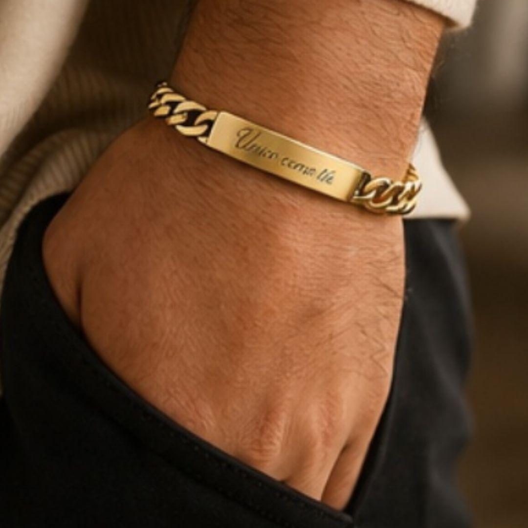 Imponente pulsera de hombre en oro amarillo 18K tipo esclava, con cadena barbada y placa grabada, una joya de lujo con carácter y presencia.