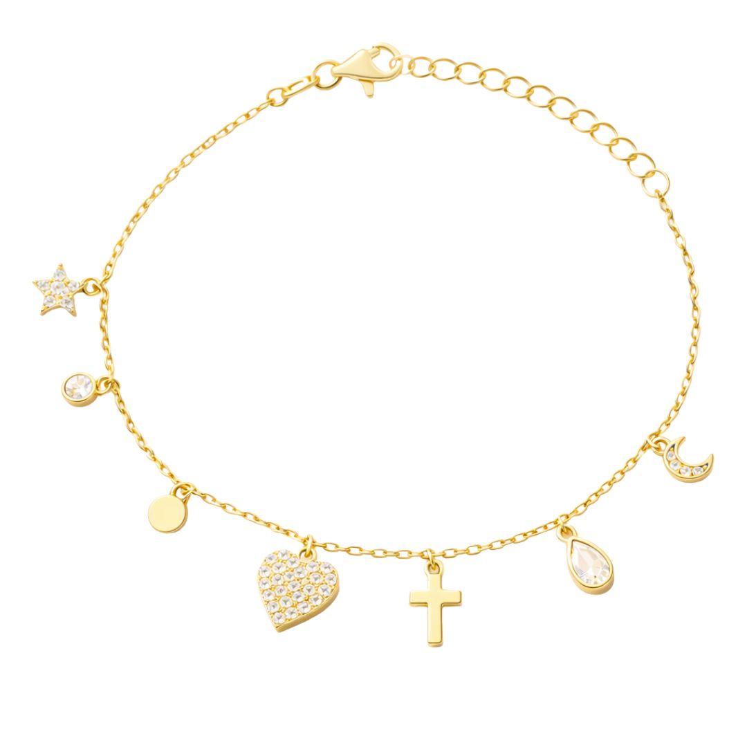 Esta elegante pulsera en plata chapada en oro con charms es una joya llena de estilo y simbolismo. Cada detalle —estrella, corazón, cruz, luna y más— representa momentos, emociones y recuerdos especiales.