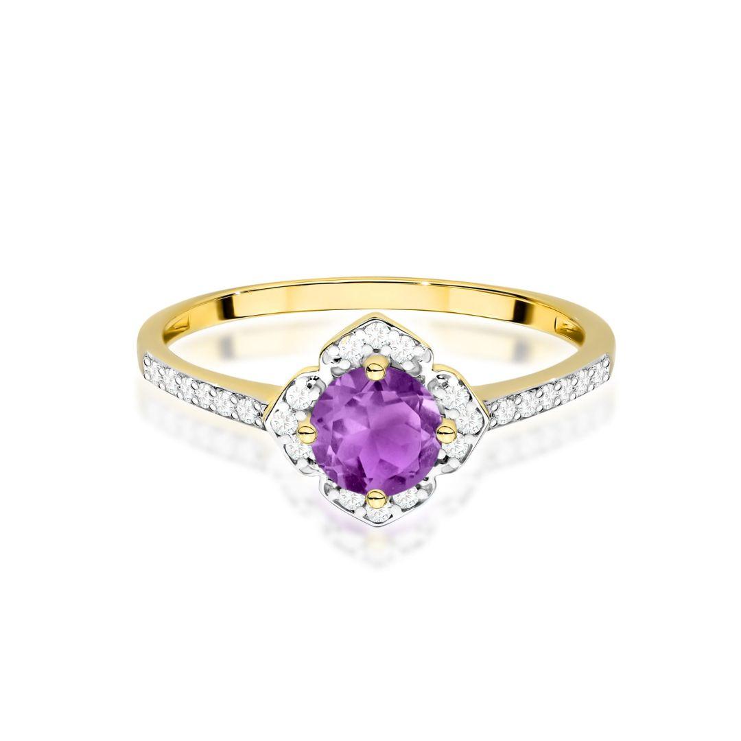 Su estilo delicado y femenino convierte este anillo de oro amarillo con amatista y diamantes en una joya ideal como regalo especial o complemento elegante para cualquier ocasión.