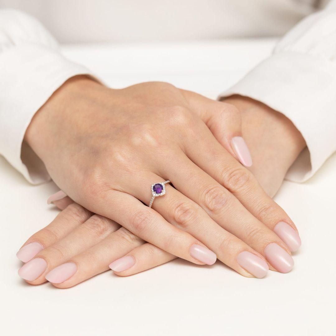 El anillo Luna de oro 14K con amatista natural y diamantes destaca por su elegante diseño con amatista redonda de 0,50 ct, rodeada de diamantes naturales que aportan un brillo intenso y refinado.