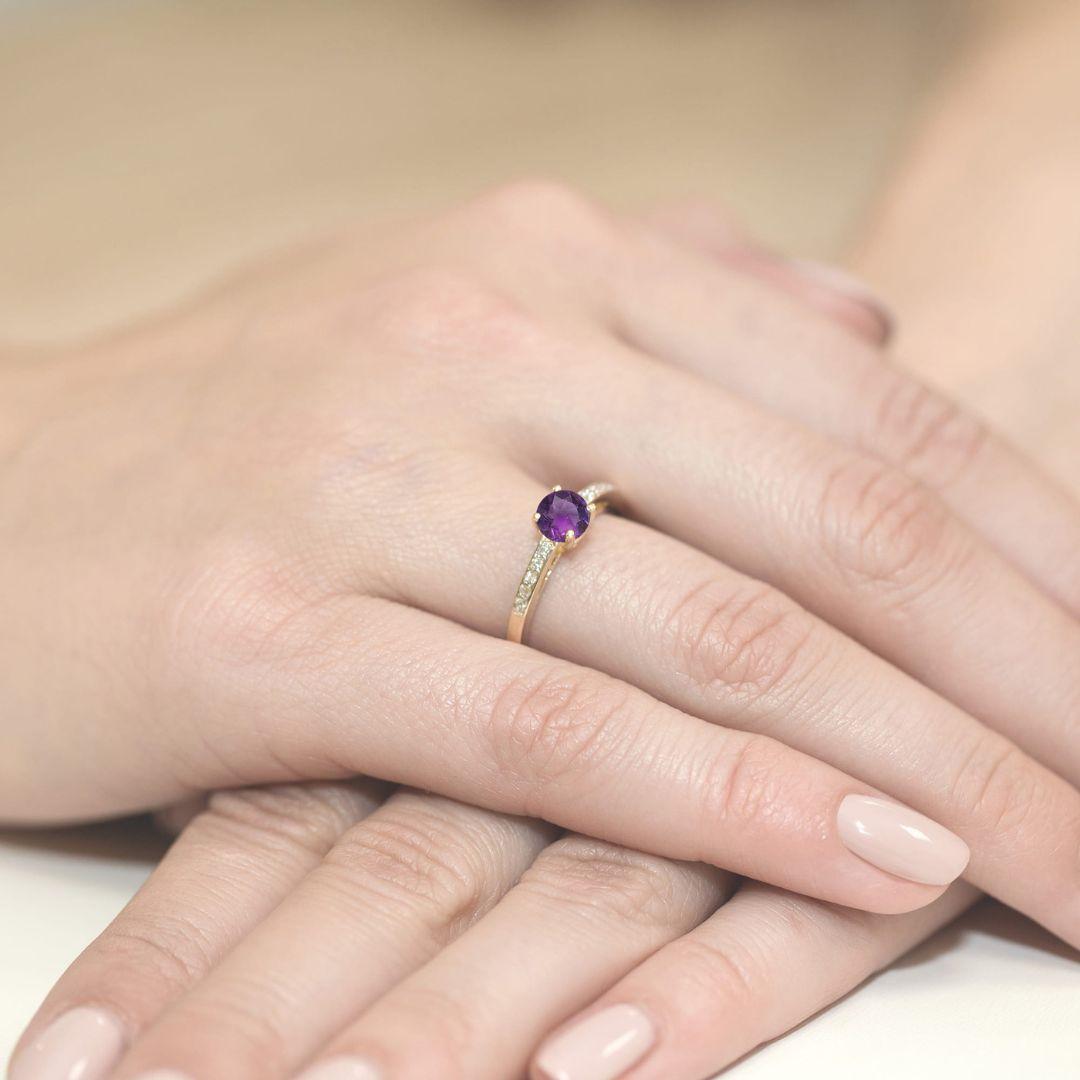 Elegante anillo de oro amarillo 14K con amatista natural de 0,50 ct y diamantes, una joya fina con brillo delicado y diseño sofisticado.