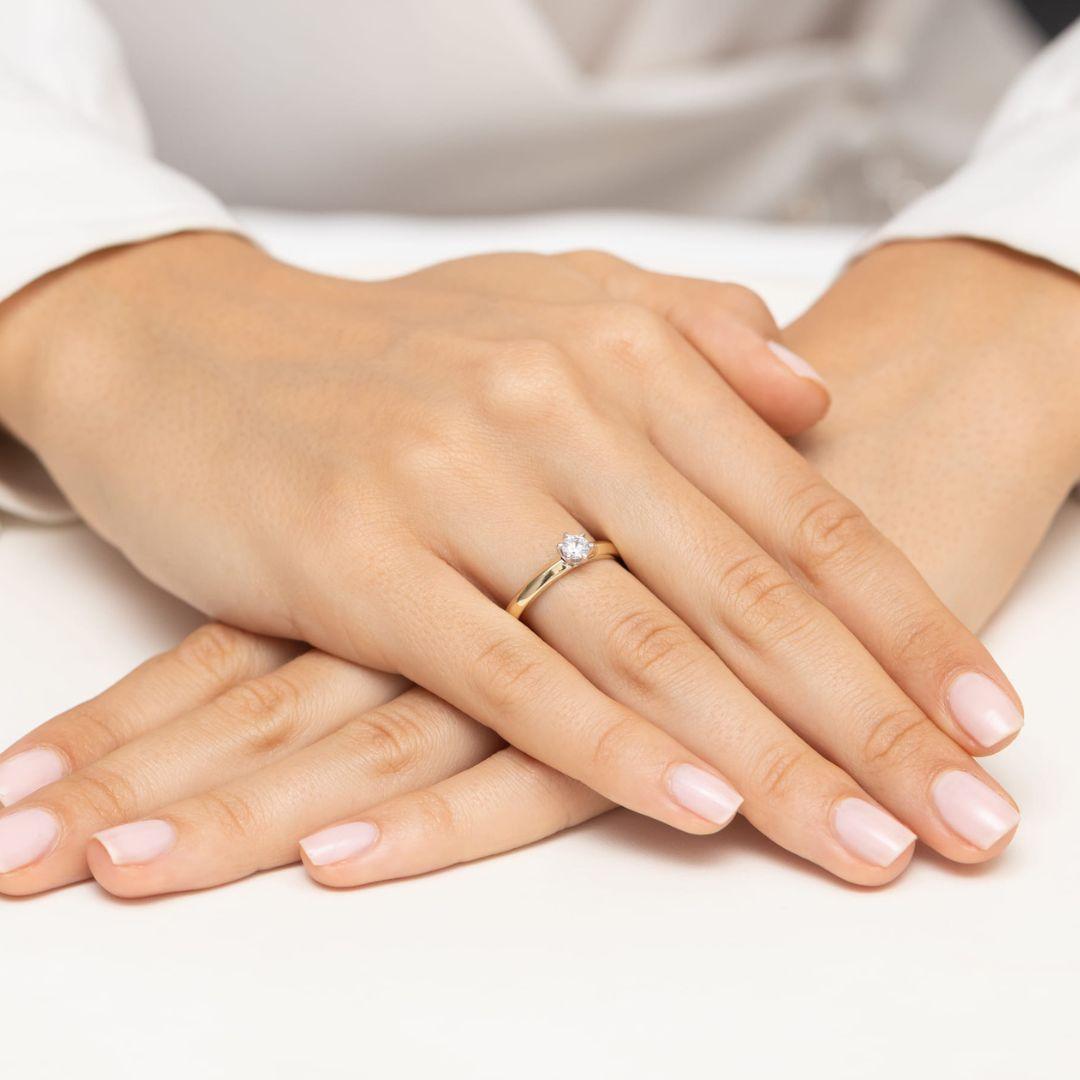 Su diseño clásico convierte este anillo de oro amarillo con diamante en una opción perfecta como anillo de compromiso, aniversario o regalo especial.