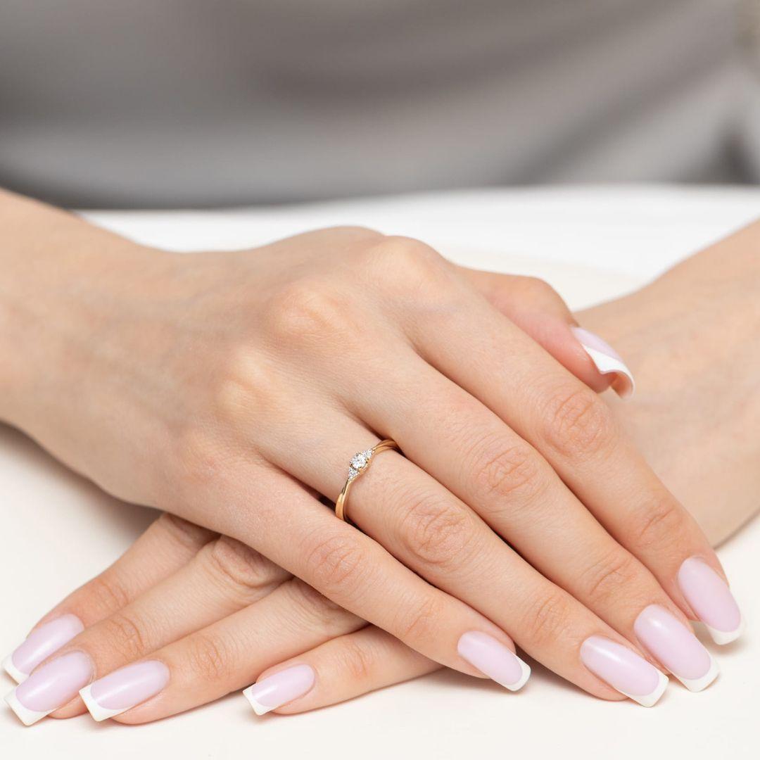 El anillo Naia de oro 14K con diamantes naturales destaca por su delicado diseño con diamante central y diamantes laterales, que aportan un brillo elegante y discreto.