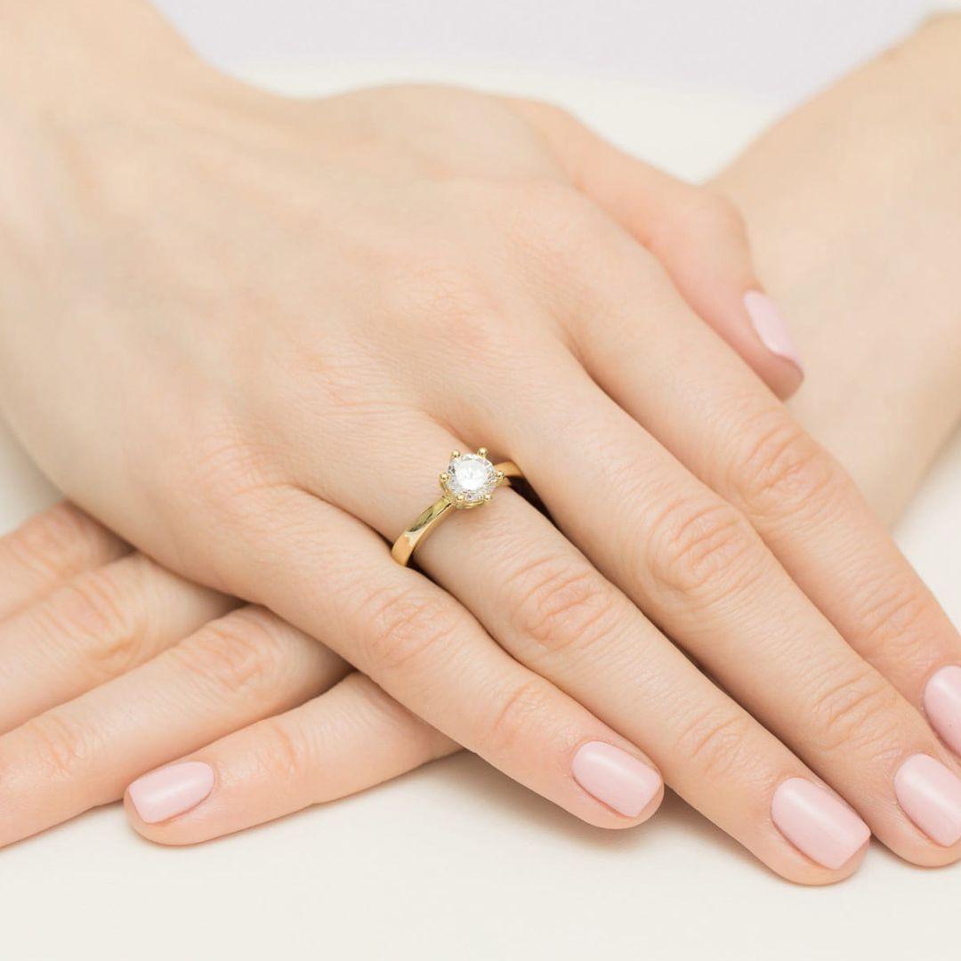 Su diseño clásico convierte este anillo de oro amarillo con diamante en una pieza ideal como anillo de compromiso de lujo, aniversario o ocasión especial.