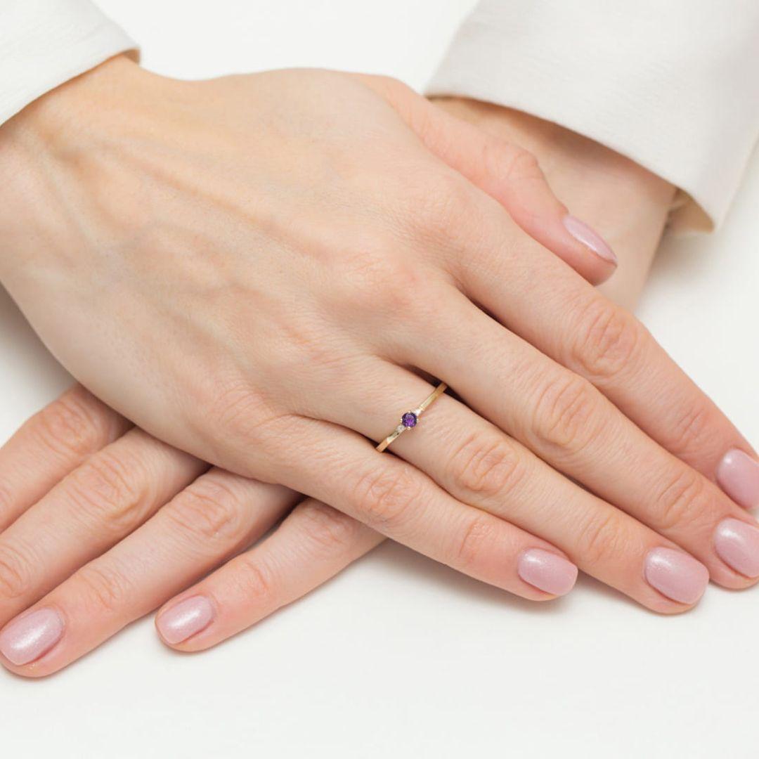Su estilo minimalista convierte este anillo de oro amarillo con amatista y diamantes en una joya perfecta para uso diario o como regalo especial.