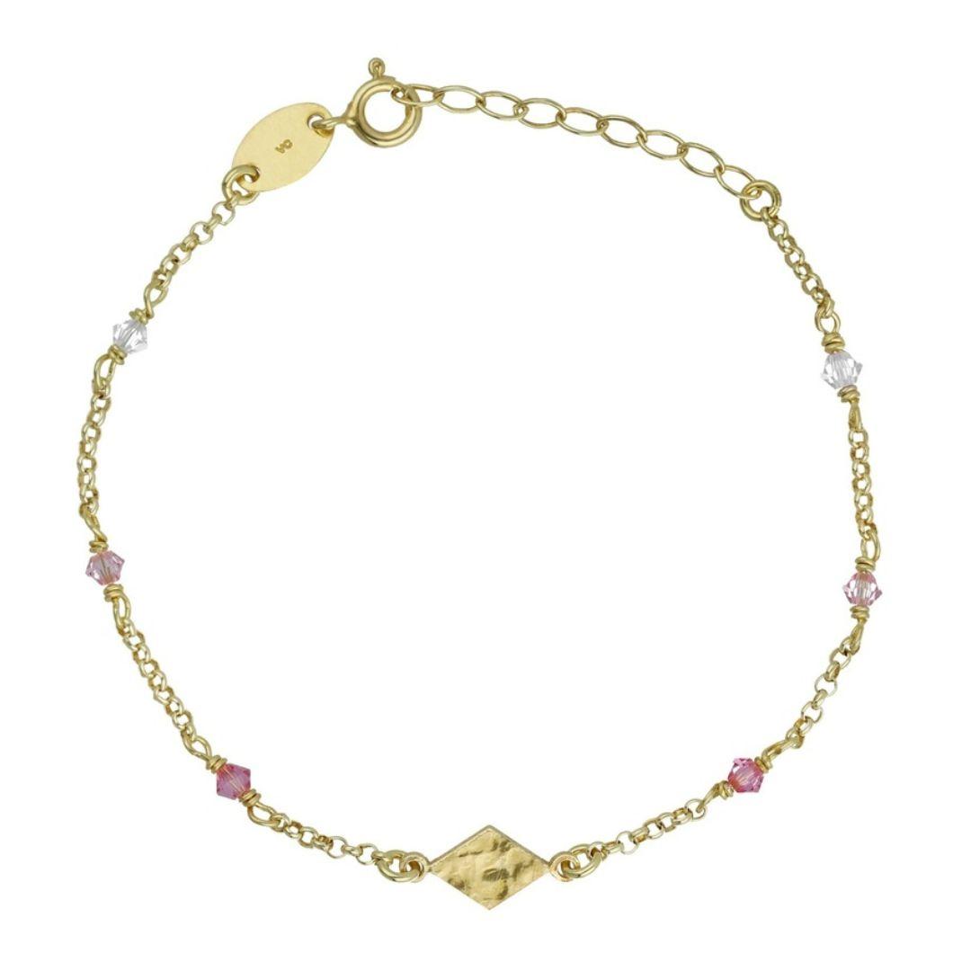 Una pulsera delicada y luminosa de la colección Anya, creada en Plata de Ley bañada en Oro de 18kt y decorada con cristales en tonos fucsia y blanco. Su motivo rectangular martelé aporta un acabado artesanal y elegante.