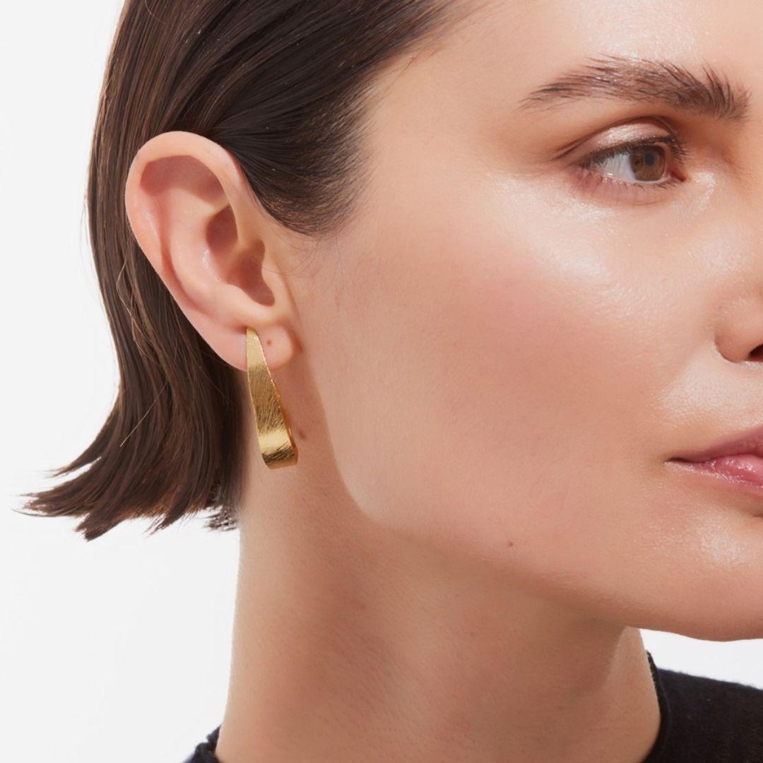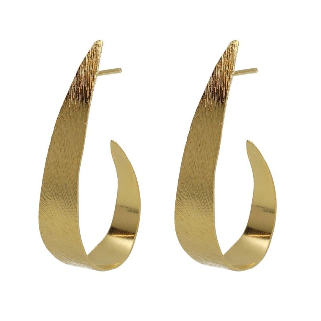 Pendientes de aro con diseño envolvente y textura satinada, elaborados en Plata de Ley bañada en Oro de 18kt. Una pieza moderna, ligera y llena de carácter, perfecta para elevar cualquier look.