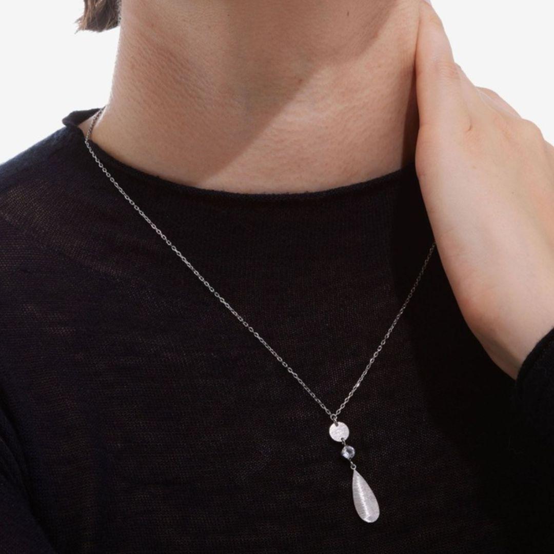 Un collar luminoso y contemporáneo con lágrima texturizada y cristal blanco brillante. Su diseño minimalista y elegante aporta frescura y sofisticación, perfecto para elevar cualquier look.
