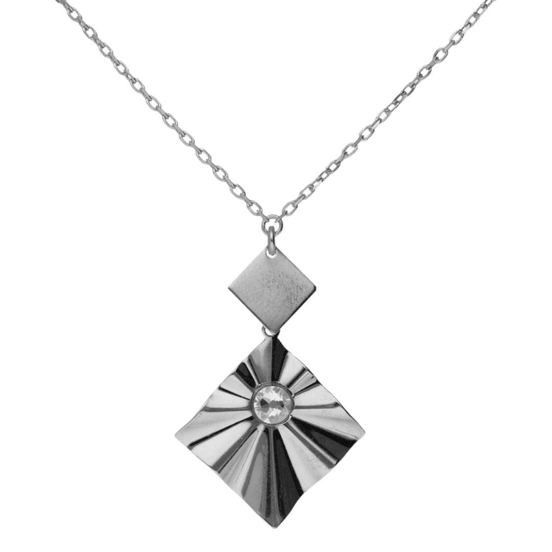 Collar rombo en Plata 925 con baño de Rodio y cristal brillante. Un diseño moderno y elegante con acabado luminoso.