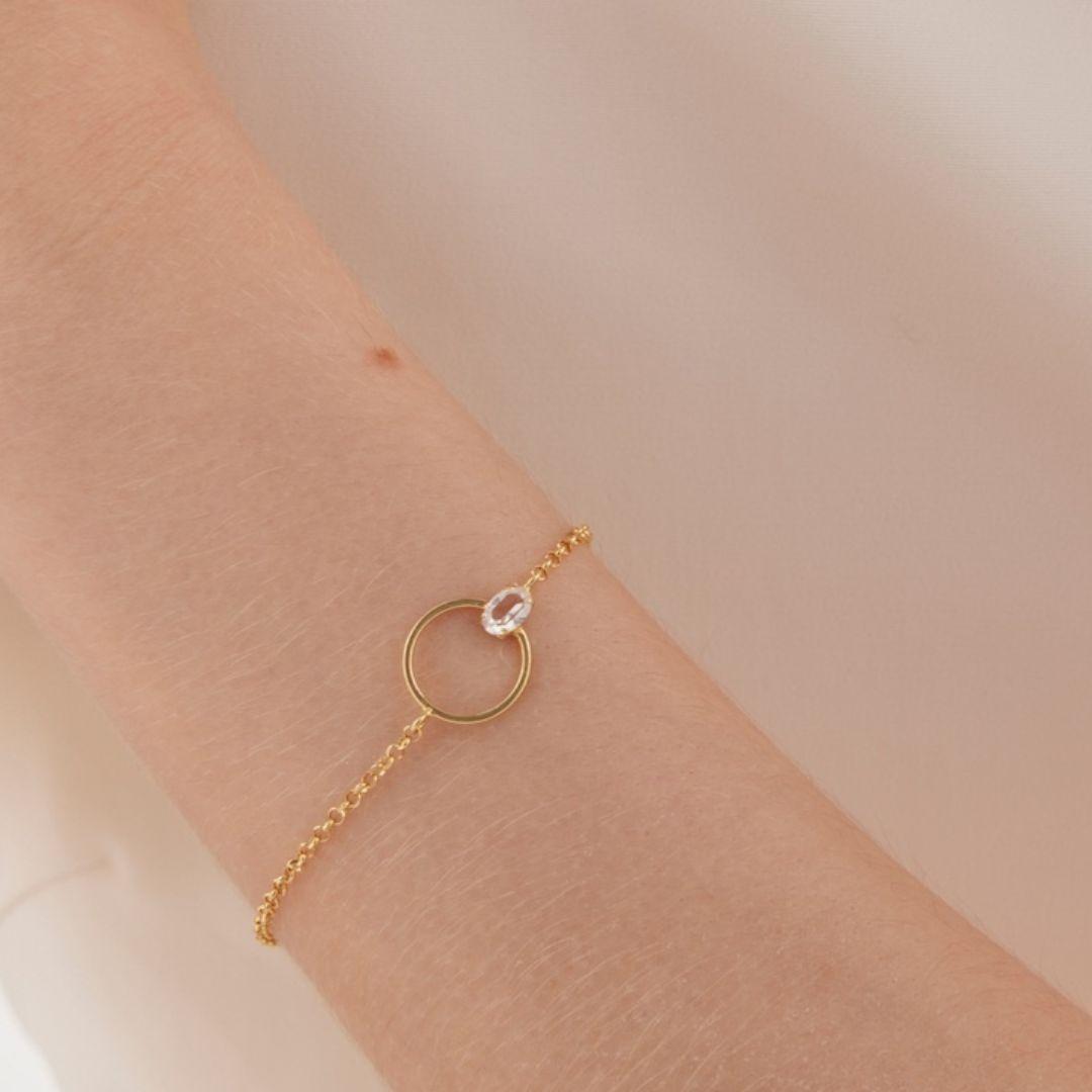 Pulsera fina y luminosa con motivo oval y círculo, elaborada en Plata 925 bañada en Oro 18kt e iluminada por un cristal blanco facetado. Un diseño delicado y actual, perfecto para combinar a diario o regalar. Acompañada con caja de regalo.