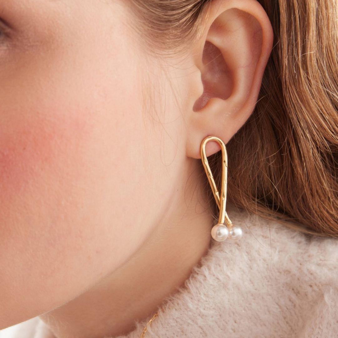 Estos pendientes de la colección Sera combinan un estilo actual con un toque clásico gracias a la belleza natural de la perla. Fabricados en Plata de Ley 925 con baño de Oro de 18 kt, presentan un diseño en forma de lazo alargado con sutil textura que aporta movimiento, suavidad y luz al rostro.