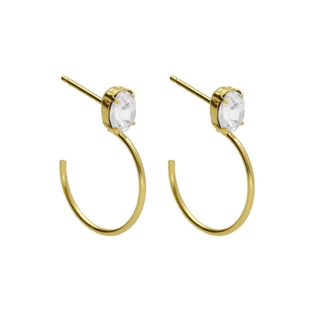 Los Pendientes Genoveva Oval combinan la elegancia del aro dorado con la luminosidad del cristal blanco en talla oval. Un diseño moderno, ligero y perfecto para el día a día.