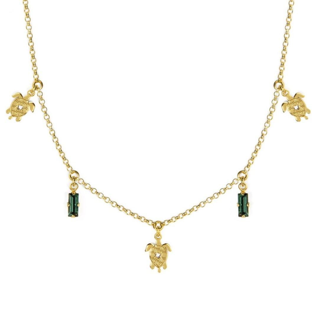 Un collar lleno de luz, color y simbolismo. El Cocolada Tortuga combina charms dorados de tortugas con cristales verdes para un look moderno, divertido y especial.