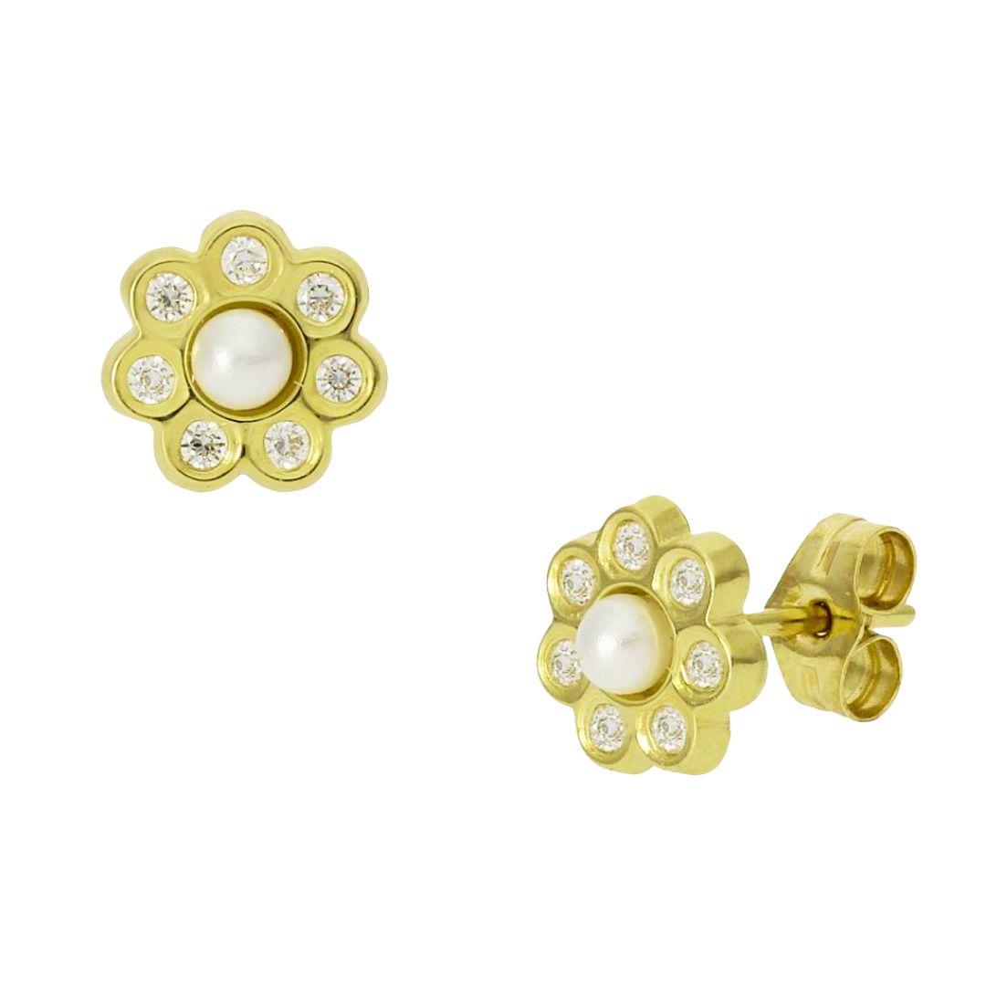 Pendientes Flor Oro 18K con Perla y Circonitas