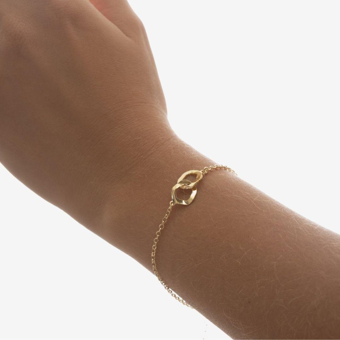 La Pulsera Essence combina dos círculos entrelazados en un diseño dorado sofisticado, perfecto para aportar estilo y significado a tu look diario.