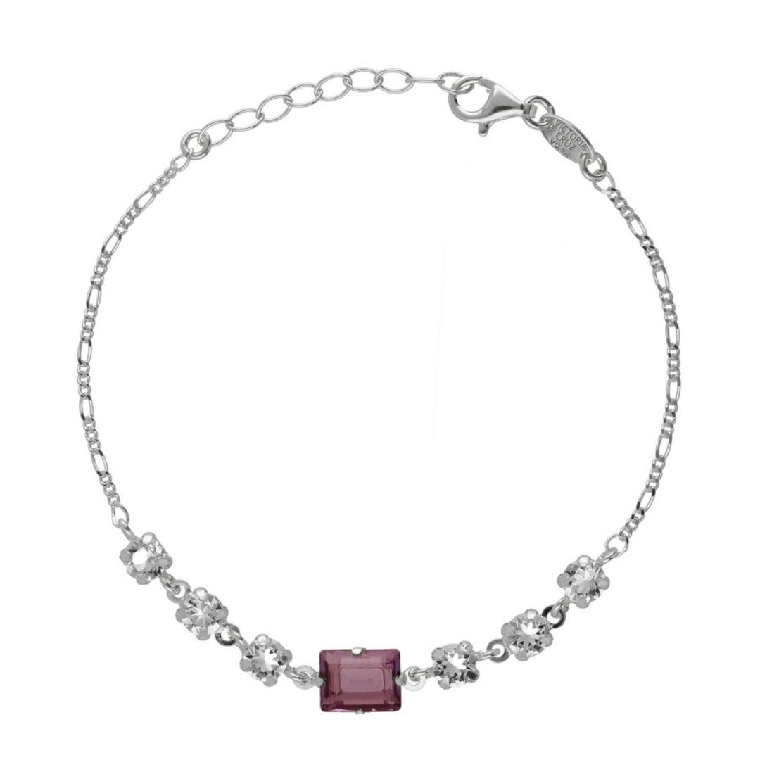 La Pulsera Serenity Rectángulo Rosa está diseñada para quienes buscan un complemento sutil pero con un brillo especial. Fabricada en Plata de Ley 925 bañada en Rodio, presenta un diseño armonioso formado por pequeñas flores de cristal blanco que enmarcan un cristal central Light Amethyst de corte rectangular.