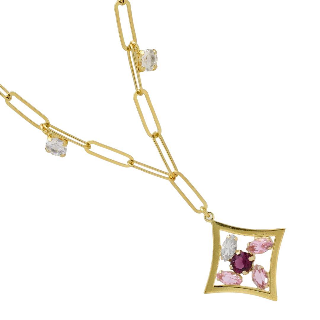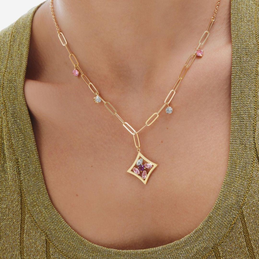 Collar corto de amatista natural y plata de ley bañada en oro de 18K, con elegante motivo en forma de rombo. Diseño exclusivo de la colección Paris Victoria Cruz, ideal para aportar color, luz y sofisticación.