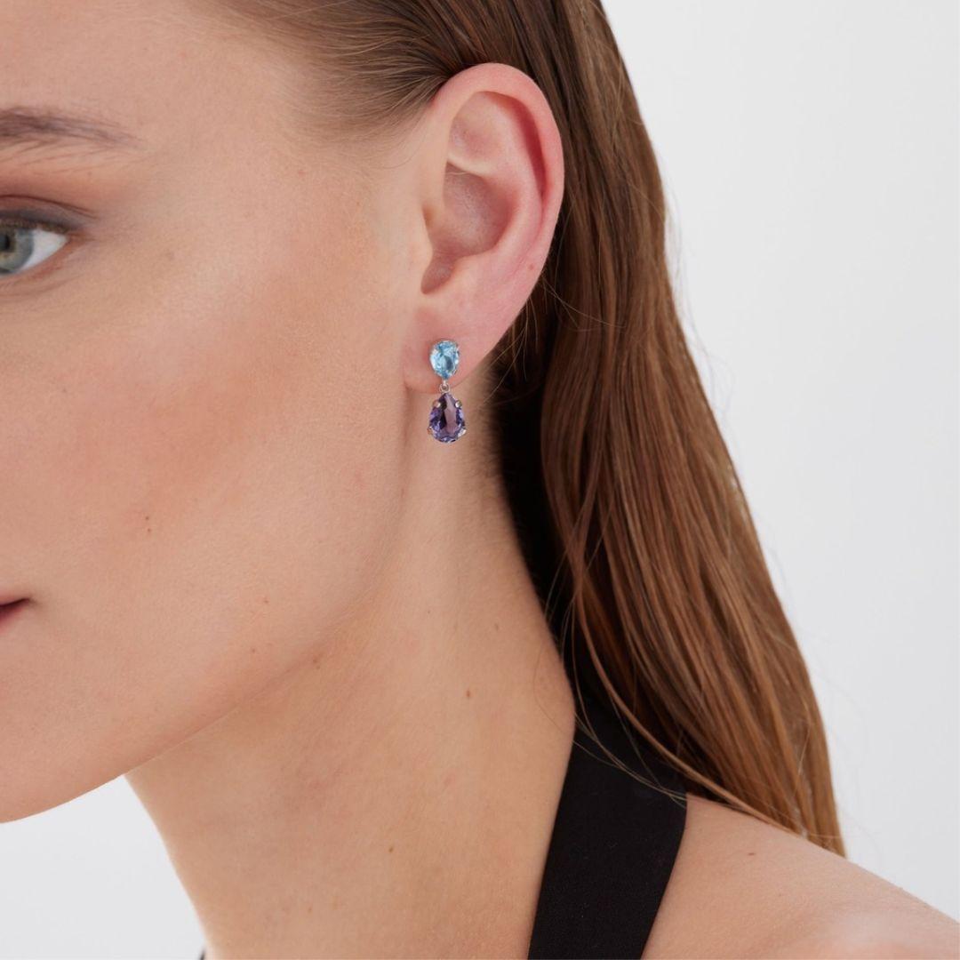 El motivo en forma de lágrima, con un tamaño de 2,1 x 0,8 cm, aporta movimiento y luminosidad al rostro gracias al brillo profundo del cristal morado. El baño de rodio sobre plata de ley 925 garantiza un acabado plateado brillante, resistente y duradero, ideal para un uso frecuente.
