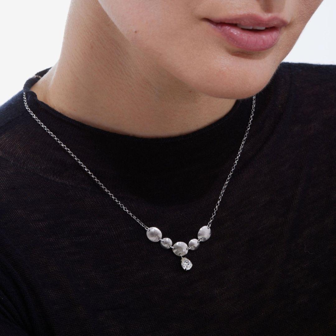 El collar presenta un conjunto de motivos circulares texturizados que aportan carácter y originalidad, culminando en un cristal en forma de lágrima que añade brillo y movimiento. Su motivo central de 1,7 x 4,5 cm destaca sutilmente sobre el escote, convirtiéndose en el punto focal de la pieza.