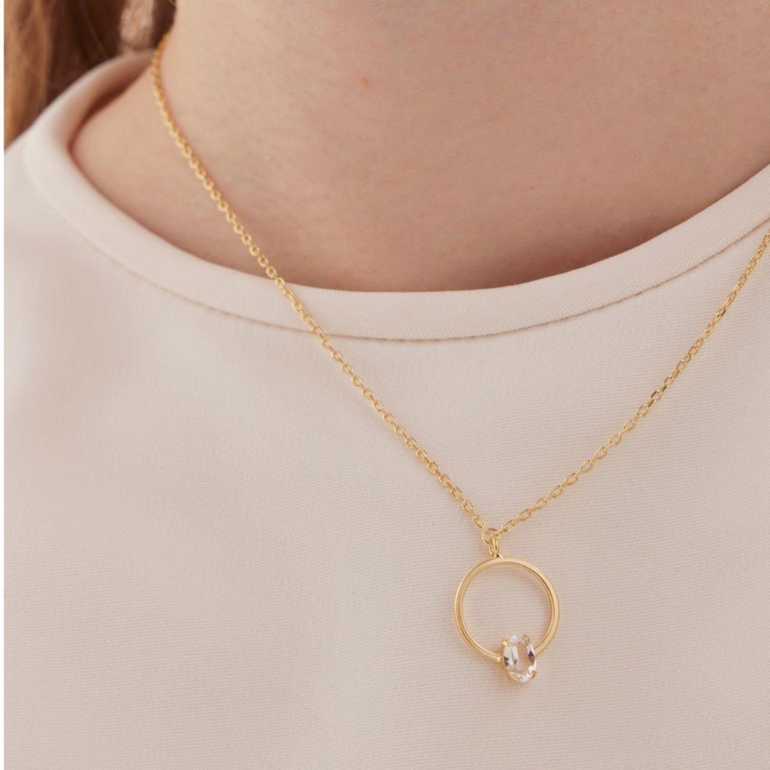 Collar corto con motivo oval y círculo con cristal blanco, elaborado en plata de ley bañada en oro de 18K. Un diseño minimalista y luminoso de la colección Lieve de Victoria Cruz.