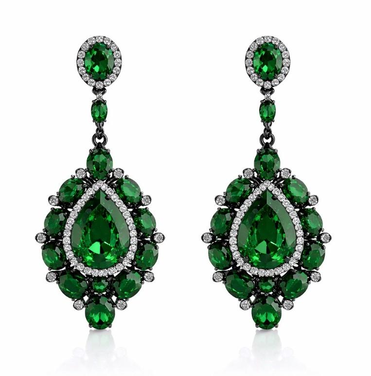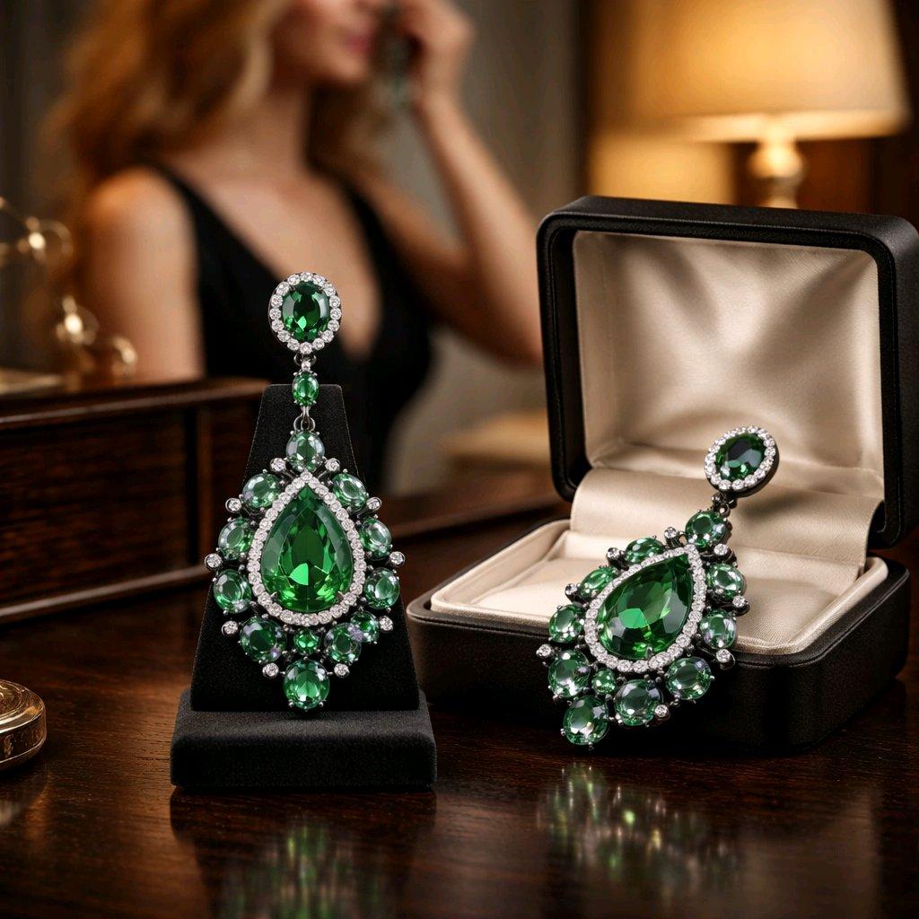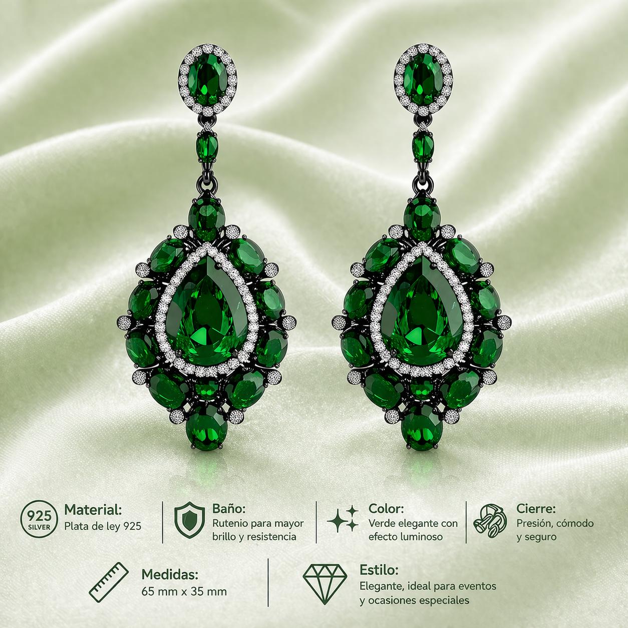 Pendientes largos de estilo elegante con piedras verde esmeralda y acabado en rutenio, diseñados para destacar en eventos especiales. Una joya sofisticada que combina brillo, tendencia y exclusividad.