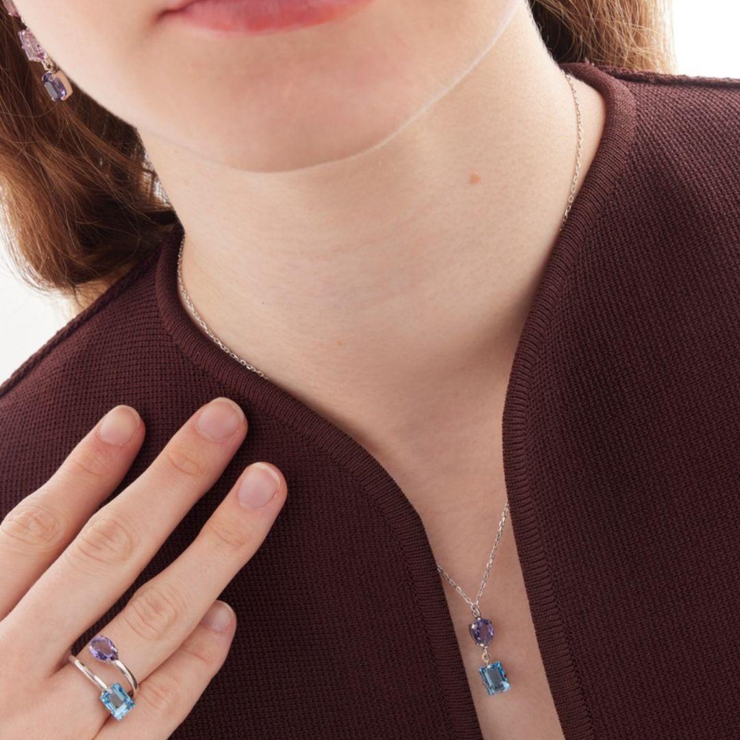 El collar corto Borea de Victoria Cruz combina la armonía del cristal azul aguamarina con la intensidad del cristal morado, creando un contraste sofisticado y lleno de personalidad. Está elaborado en plata de ley 925 con baño de rodio, un acabado que aporta brillo duradero y un tono plateado elegante.
