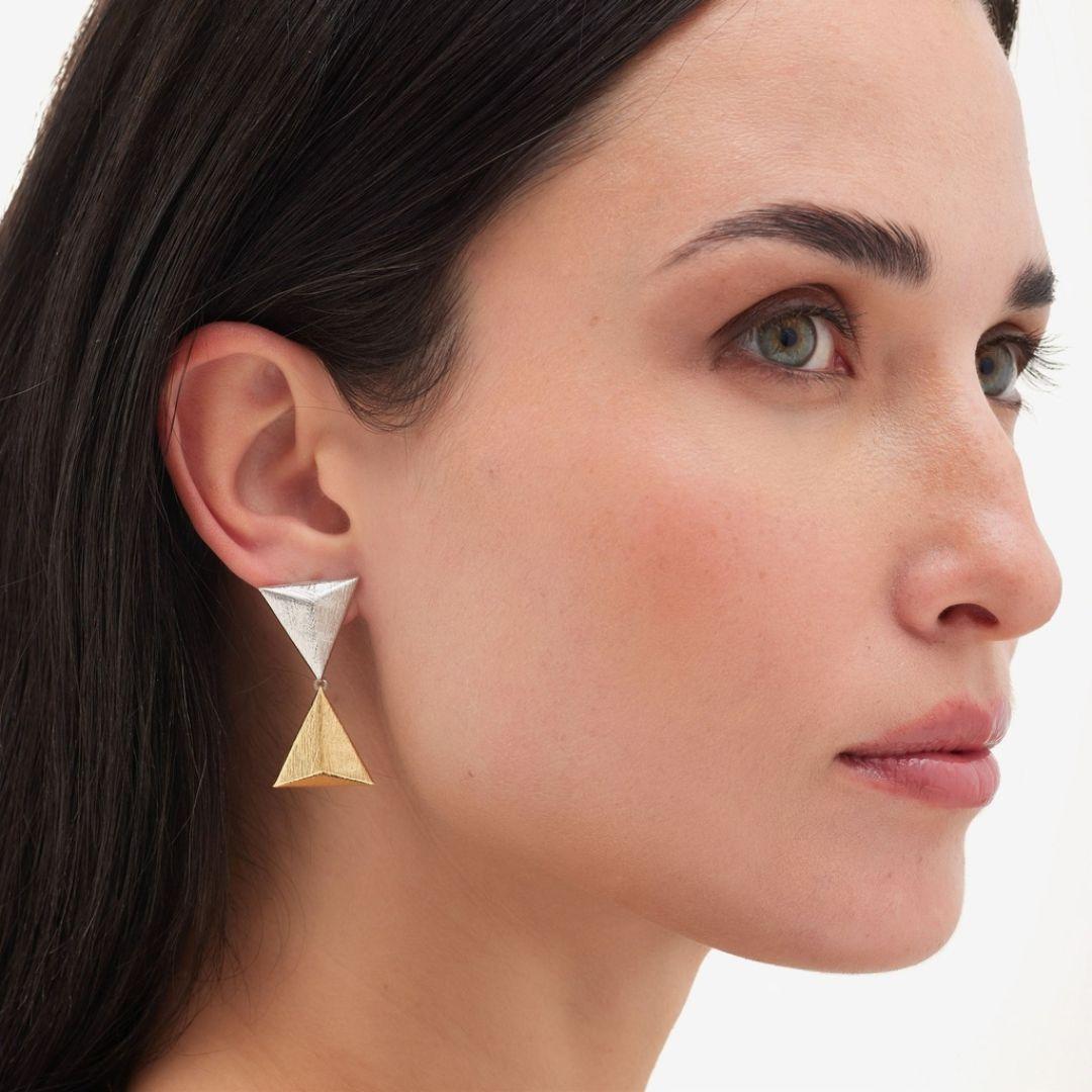 Su forma triangular texturizada aporta un aire moderno y actual, mientras que el acabado bicolor los convierte en una pieza versátil, fácil de combinar con joyas doradas y plateadas. El cierre de tuerca a presión garantiza comodidad y seguridad durante todo el día.