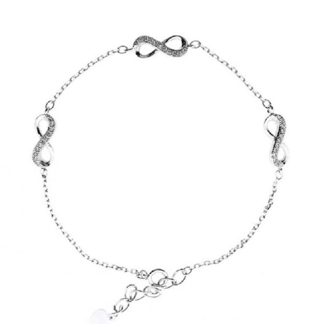 Pulsera fina de plata de ley bañada en rodio, decorada con símbolos de infinito y circonitas blancas. Un diseño elegante y atemporal que simboliza el amor eterno y la unión infinita.